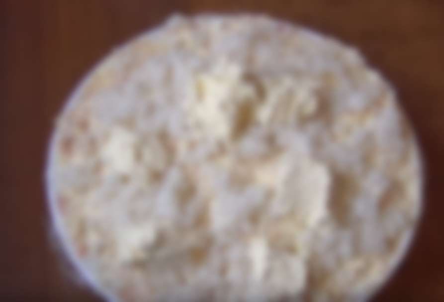 - Все остальные ингредиенты мы выкладываем слоями, промазывая каждый сливочным кремом. Компоненты выкладываем в таком порядке: 127 грамм отваренного риса, тёртый яичный желток, половина измельченных креветок, тёртый яичный белок, вторая половина измельченных креветок, 127 грамм отваренного риса.