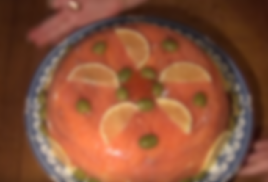 11. Затем достаем, аккуратно снимаем форму. Украшаем сверху розочкой из красной рыбы и зеленью.