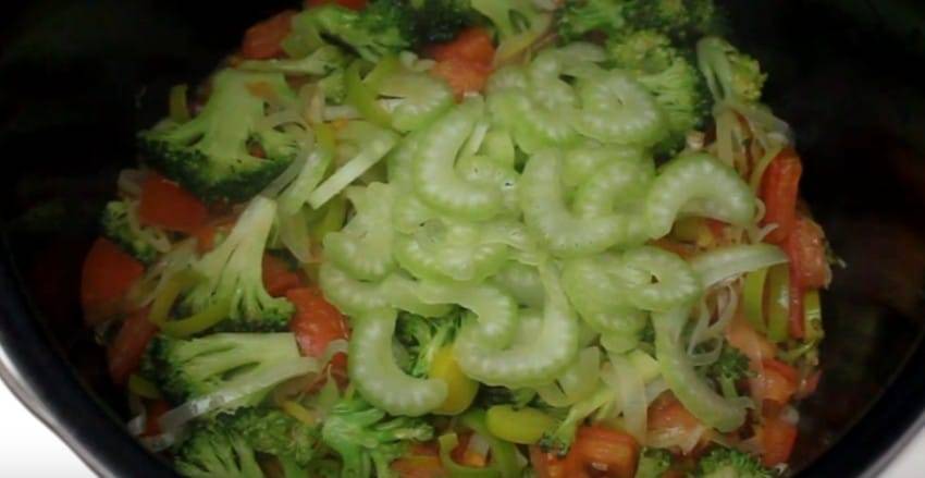4. Нарежьте лук порей, стебель сельдерея, помидор и брокколи. В чашу налейте растительное масло и обжарьте подготовленные овощи 10 минут, помешивая (режим «Жарка»).