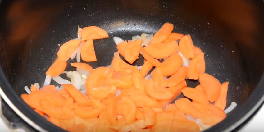 - Затем добавляем морковку к луку. Овощи можно обжаривать в режиме «Выпечка» 10 минут.