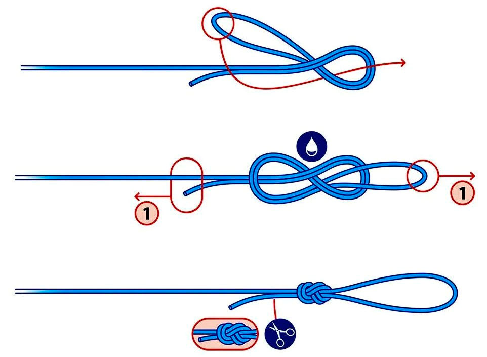 - Смачиваем узел и взявшись за каждую леску тянем в разные стороны, затягивая получившийся узел.