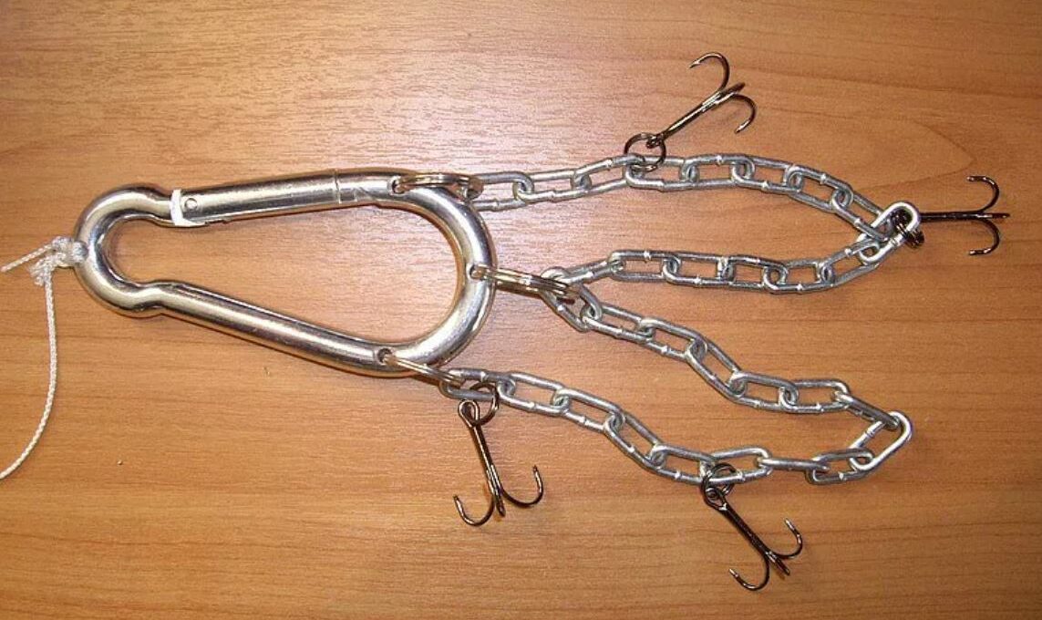 Простейшее приспособление, которое используется с лодки. Представляет собой карабин большого размера. На нем закреплены полосы из металлических колец. На их концах могут фиксироваться округлые свинцовые грузила либо мощные тройные крючки с обломанными жалами.