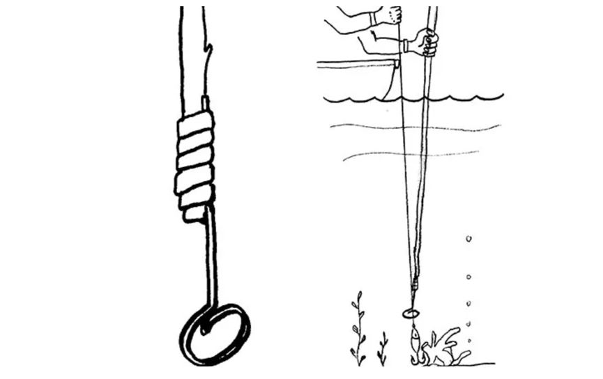 На небольшой глубине, около 1-2м, можно достать воблер с помощью простой оснастки – обычной палки с прикреплённым кольцом. Само кольцо должно подходить диаметром в соотношении с головкой воблера, но как правило – это 3-4 см.