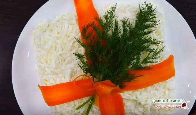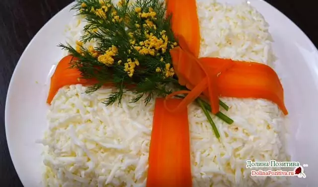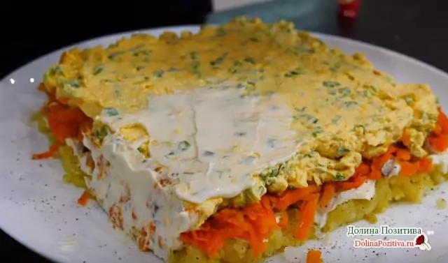 - Выложите салат слоями в следующей очередности: рыба, картошка, морковка, яйца. Слои обязательно пропитайте майонезом и дайте настояться.