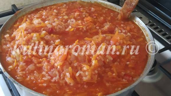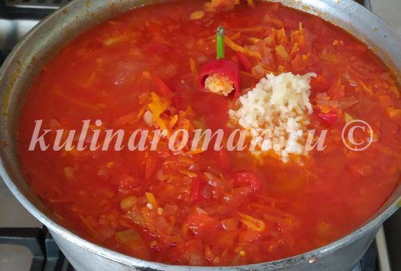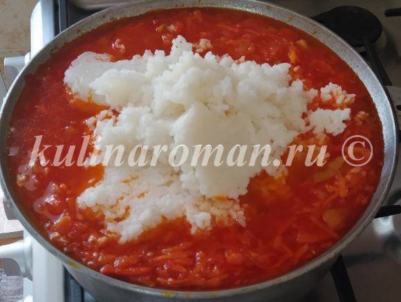 - Добавить рис, отваренный до полуготовности. Кипятить салат на небольшом огне 40 минут. В конце, минут за 5−10 до готовности, добавить уксус, хорошо перемешать.