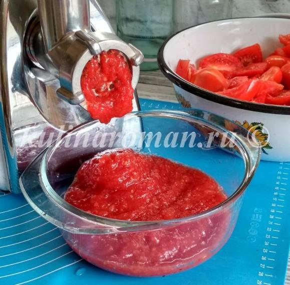 10. Теперь, самоё мое любимое – пропускать помидорки через мясорубку. Эти минутное дело. Так, что если есть в доме свободные руки – зовём на помощь)))