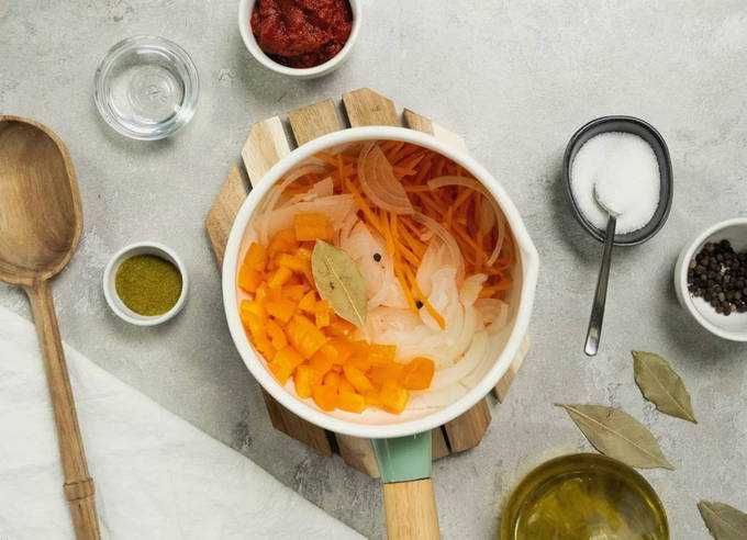 9. Итак, лук и перец измельчили, а морковку нашинковали? Молодцы! Идём дальше!
