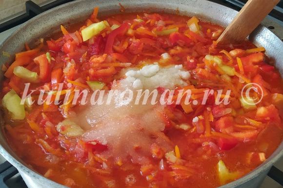 18. После того, как перемешали, добавляем соль и сахар. Перемешиваем хорошо, накрываем крышкой посуду и тушим салат, на слабом огне, ровно 40 минут. Периодически помешиваем.