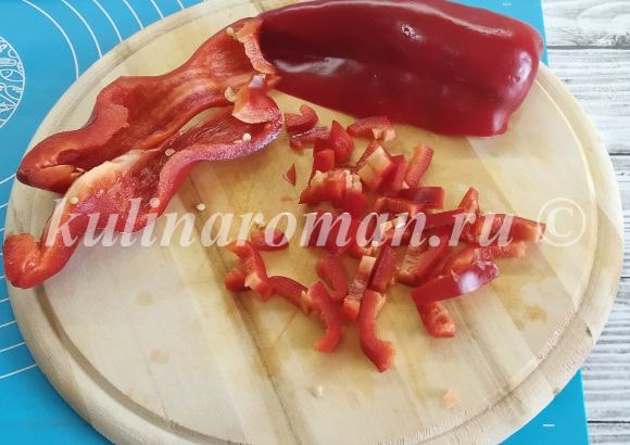 7. Болгарский сладкий перец моем, разрезаем на две части и удаляем плодоножку с семенами. Нарезаем на мелкие кусочки.
