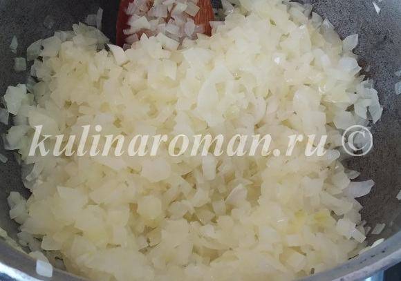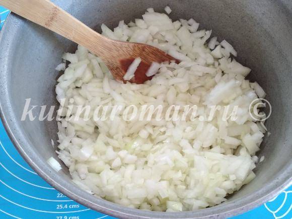 - Налить на дно толстостенной кастрюли немного растительного масла и обжарить в нем лук до прозрачности.