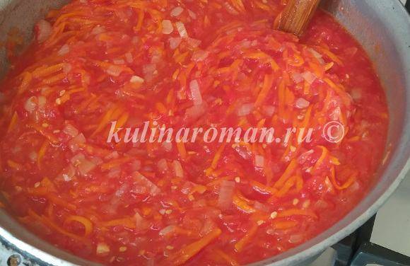 - Наконец, положить к остальным овощам томаты и приправы и выдержать все ингредиенты на среднем огне 5–7 минут, регулярно помешивая лопаткой.