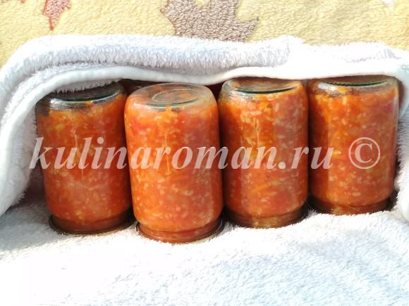 8.Готовое блюдо разложить в подготовленную тару, закатать до упора, перевернуть и поставить на крышки.
