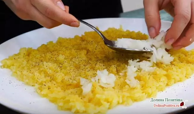 - Сварите картошку, яйца, морковь. Картофельные клубни потрите на крупной терке, морковку и яйца на средней.