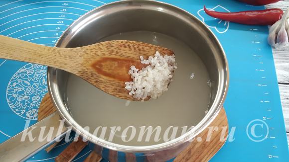 - В кастрюлю налить воду, довести её до кипения, всыпать рис и отварить до полуготовности. Воду слить.