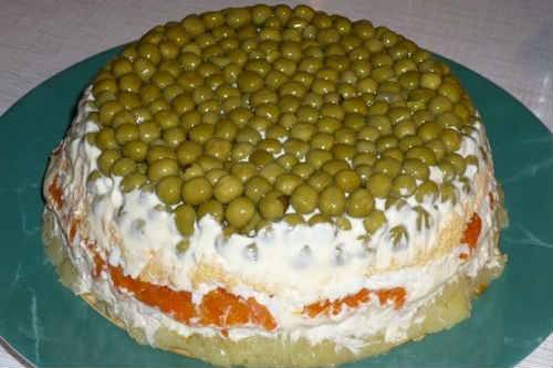 - Смотрите на фото, как украшен салат. Из зеленого горошка сделана оригинальная шапочка.