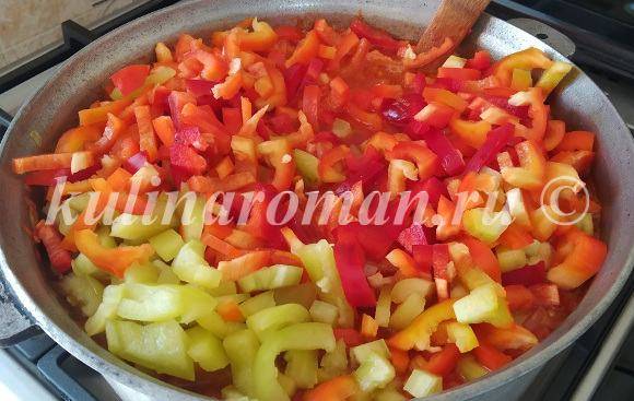 17. И следом добавляем весь болгарский перец. Перемешиваем все овощи.