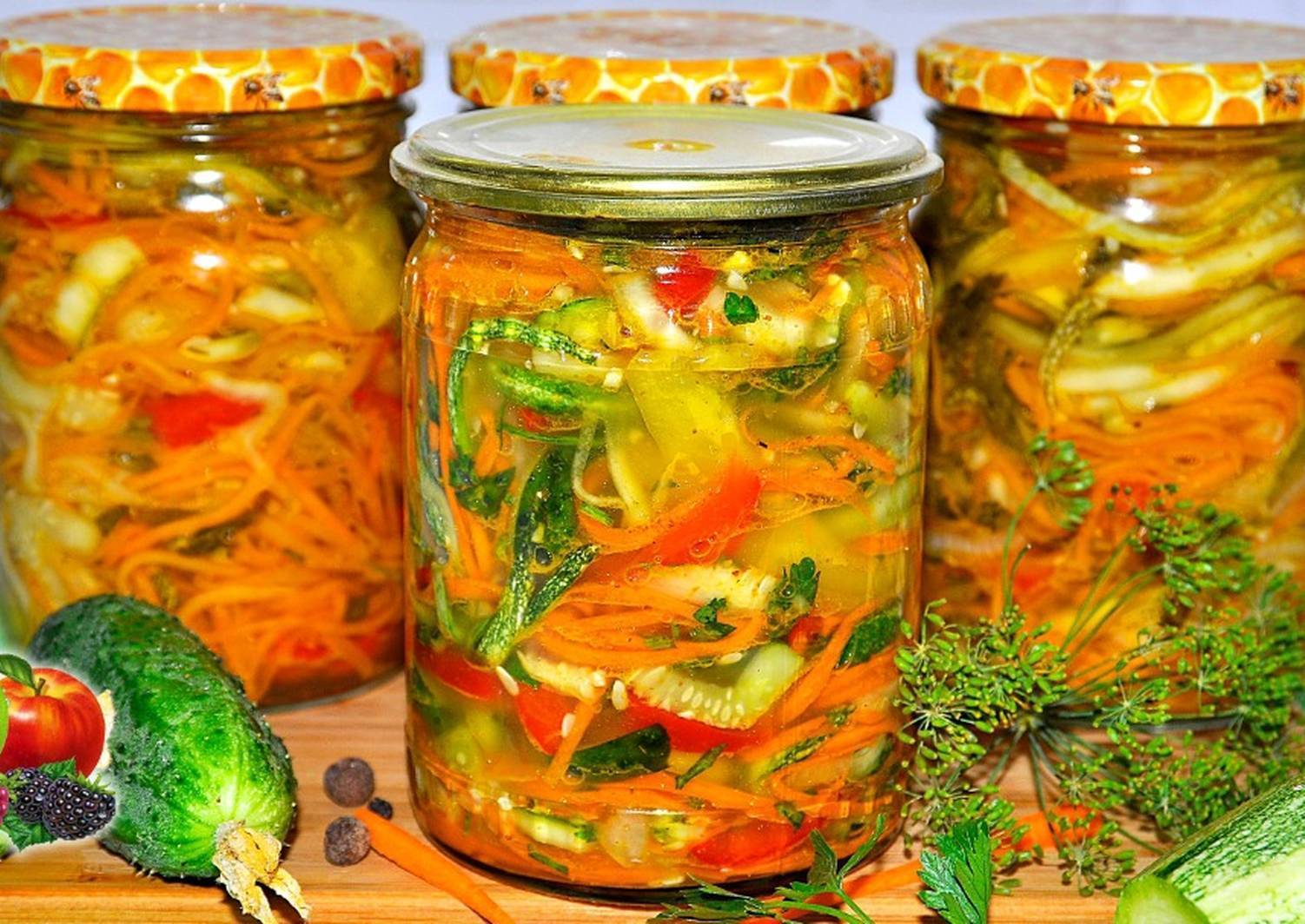 Если дополнить базовый рецепт кабачками, то результат вас порадует. Вы получите сочную, вкусную закуску, которая выручит вас всегда. Это может быть самостоятельное блюдо, особенно в постные дни. А также это отличный гарнир к мясным и рыбным блюдам.