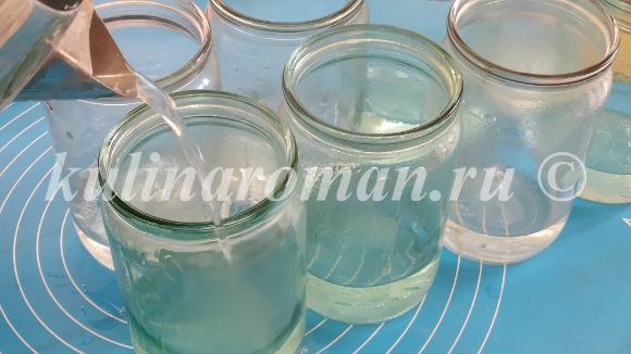 1. Итак, поехали? Первым делом простерилизуем банки. Их я хорошо помыла с пищевой содой и тщательно сполоснула под проточной горячей водой. Обдала каждую банку крутым кипятком и оставила на минут 20. С крышками поступила аналогично.
