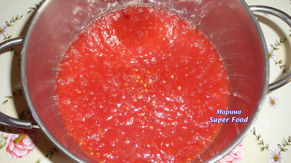 - В посуду, в которой будете варить салат, налить томатный сок, добавить чеснок, пропущенный через пресс. Поставить на плиту, довести до кипения. Добавить соль, сахар, растительное масло, ваши любимые специи. Проварить 5 минут.