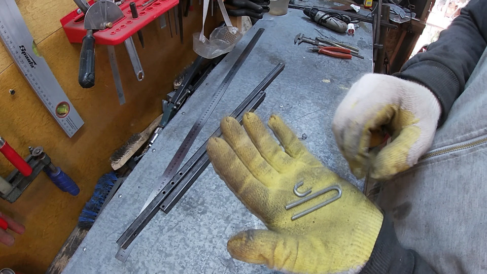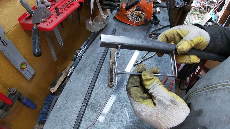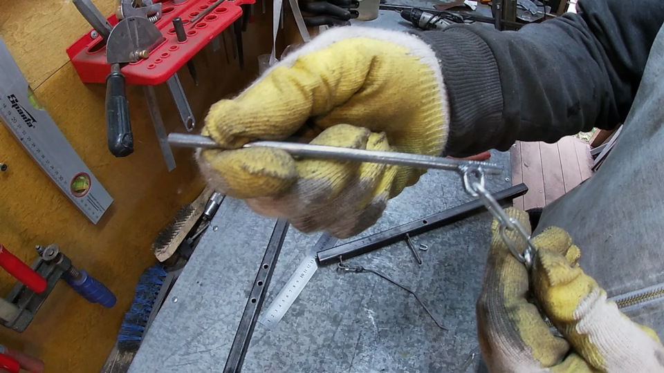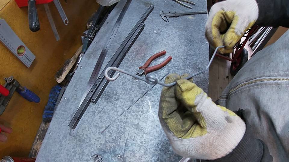- Двигающиеся элементы фиксируются на 6-7 см ниже от верха стойки, когда она находится в рабочем положении. На задней части устанавливается небольшой крючок из проволоки.