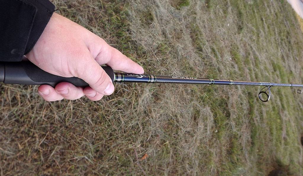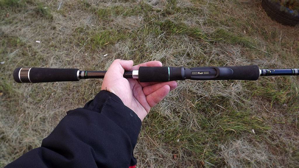Первые впечатления. Спокойные тона зеленого с серебром и элементами «карбона». Не скажу, что спиннинг выглядит дорого или имеет запоминающийся яркий дизайн. Уже обычная для всех разнесённая ручка из EVA с катушкодержателем Fuji – смотрится вполне гармонично. Сразу бросается в глаза перекрестная оплетка комеля, что должно говорить о повышенной сдерживающей мощи удилища.