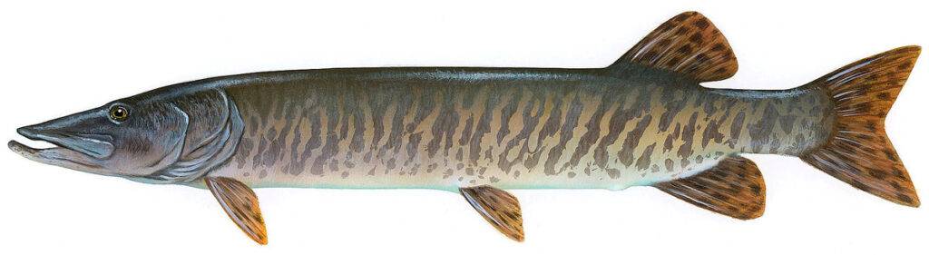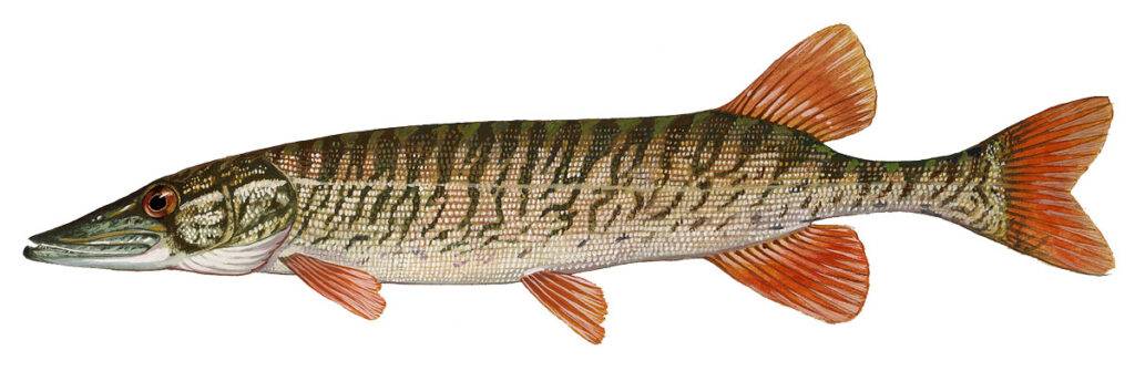 Особенности ► Американская щука некрупная. Длина тела взрослой особи достигает 45 см, а вес около 1 кг.► Основной окрас — серо-бежевый с серебристо-красным отливом. Брюхо бежевое. Плавники полупрозрачные, красноватые.► Срединная линия светлая. При этом на теле присутствуют многочисленные толстые черно-зеленые полосы.