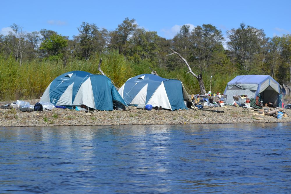 Заманчиво, если по периметру участка располагаются заломы. Ожидания от ловли в этой зоне настолько высокие, что рыболовы спокойно относятся к тому, что от базового лагеря она может находиться в нескольких часах хода на лодке. Иногда рыболовы даже встают здесь временным биваком прямо у воды (фото 4), проводя несколько дней на одной точке в ожидании поклевки.