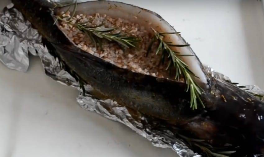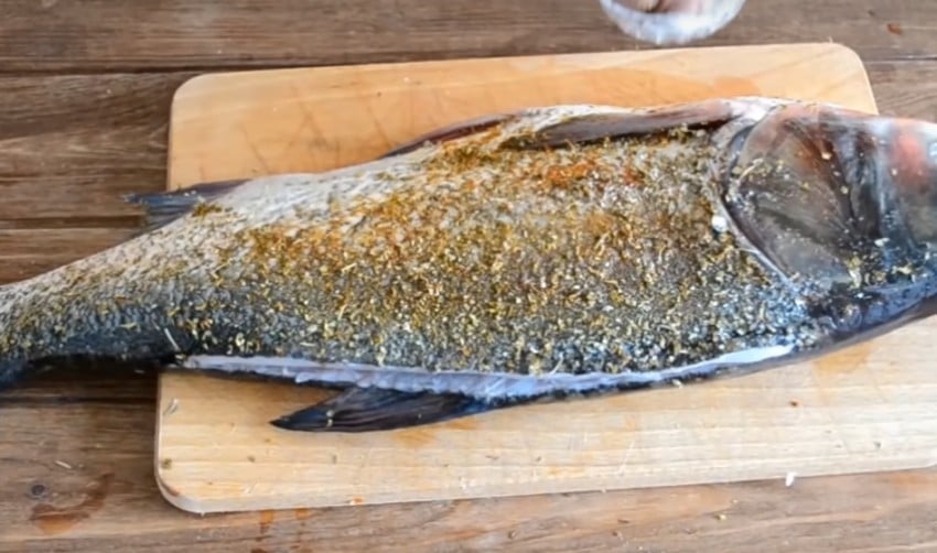 - Толстолобик очищается, удаляется голова, всё хорошенько натирается солью и пряностями, не пропустив ни одного сантиметра.