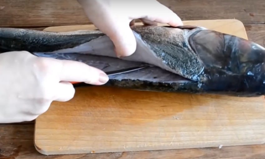 - Возле хвоста внутри нужно отрубить хребет, чтобы он остался с кожей.