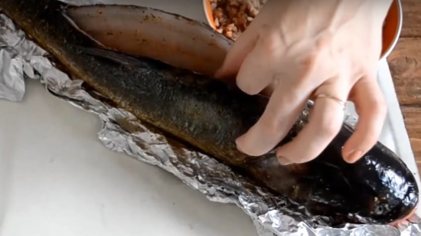 - Крупная рыбёшка набивается начинкой из грибов и зашивается брюшко ниткой, чтобы начинка не вываливалась в момент приготовления. Готовить кушанье в духовом шкафу приблизительно 60 мин., до аппетитной корочки.