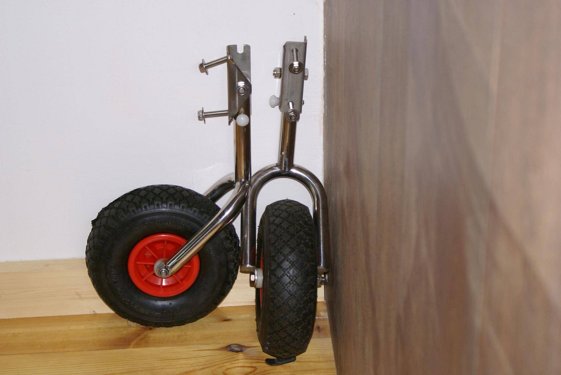 Наиболее часто изготавливаемыми своими руками видами транцевых колес являются быстросъемные, перекидные и шасси на струбцинах.