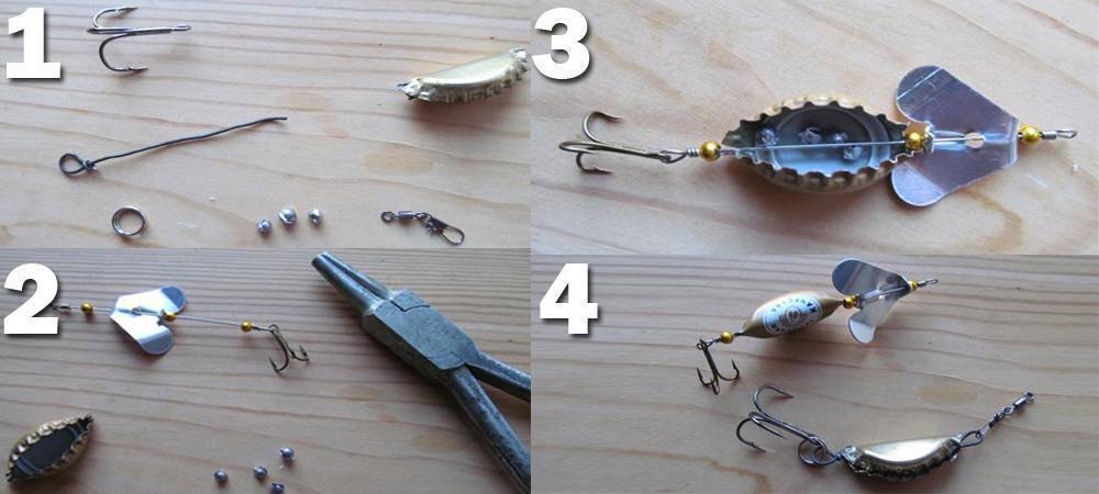 - Заново собираем блесну, оставляя место между тройником и лепестком под пивную крышку.