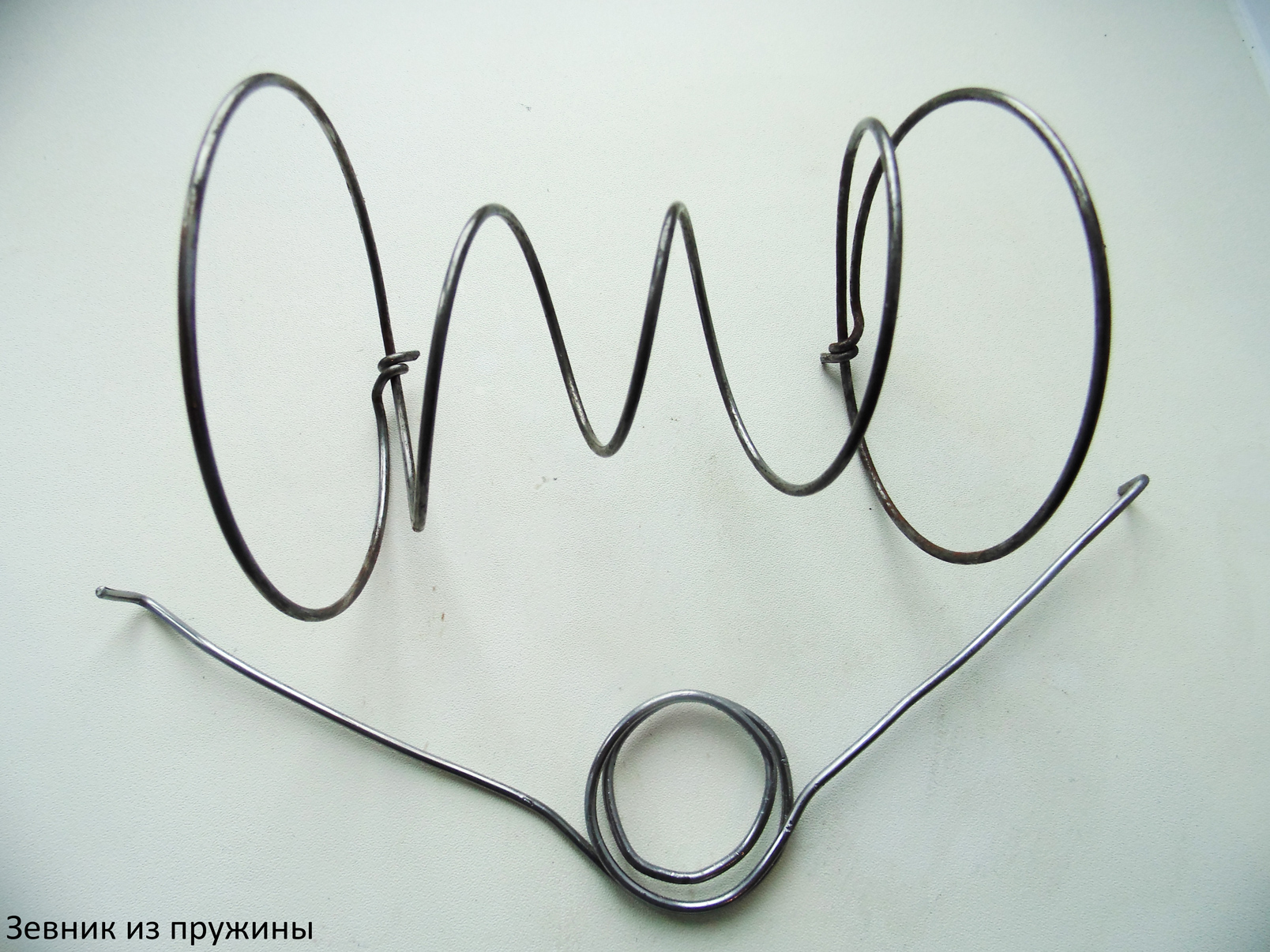 Главная сложность изготовление зевника из пружины в том, что необходимо распрямить пружину. Для этого плоскогубцами разгибаем витки пружины и отбиваем на наковальне. Цель — получить равную прямую заготовку. При изготовлении не должно быть сколов и трещин на поверхности пружины, иначе она лопнет в процессе повторного сгибания. Все манипуляции повторяем, как и в случае со спицей. Есть нюанс: лучше сделать не один, а два — три витка. Повторно пружину толщиной 2,5 мм лучше накручивать на болванку диаметром 1−1,5 см.